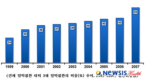 조성원 교수에 따르면 이번 분석 결과 한국인에게서 가장 많이 나타나는 3대 망막질환인 당뇨병성망막증, 황반변성, 망막정맥폐쇄증의 경우 전체 망막질환 대비 비중이 1999년 24%에서 2007년에는 53%까지 치솟은 것으로 나타났다.