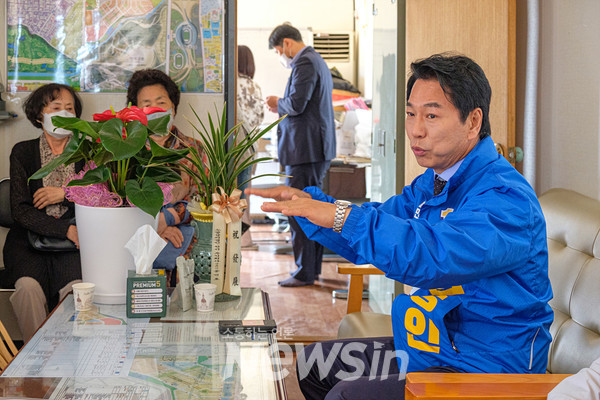 [뉴스인] 민경찬 기자 = 김종인(민주) 인천 서구청장 후보가 14일 오후 인천 서구 경서3지구 도시개발사업 현장 경서3구역 대책 사무실에서 토지주들과 간담회를 하고 있다.