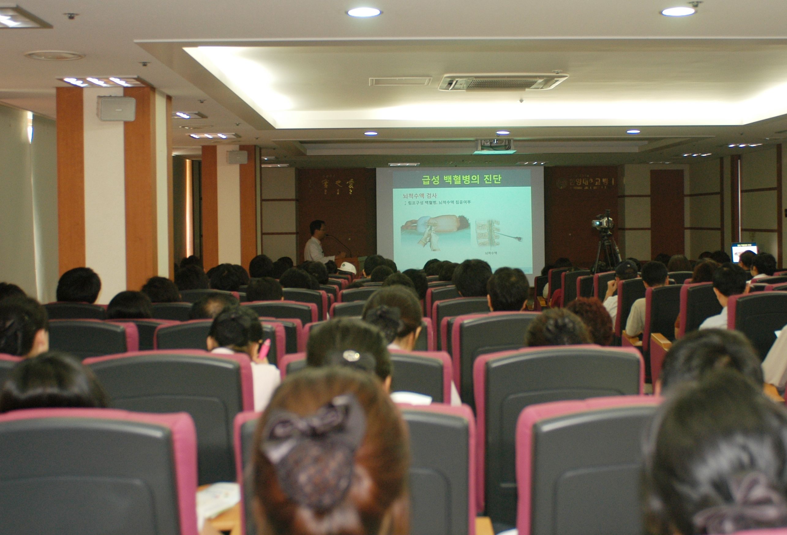 혈액종양내과 박병배 교수는 이날 강의에서 "백혈병의 위험인자로는 환경적 요인, 화학약품, 항암제 및 방사선 치료, 유전 등이 있다"고 설명하고 "백혈병 치료를 위해 조혈모세포이식을 했을 경우, 의료진이 교육하는 식사, 대인관계, 사회활동 등 의료진이 교육하는 이식 후 생활을 지켜야 한다"고 말했다.