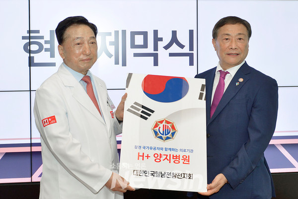 [뉴스인] 민경찬 기자 = 에이치플러스(H+) 양지병원 김철수 이사장(왼쪽)이 지난달 29일 병원 세미나실에서 대한민국 월남전참전자회 이화종 회장과 지정병원 및 포괄적 의료 협력에 관한 협약을 체결하고 지정병원 현판을 제막하고 있다.