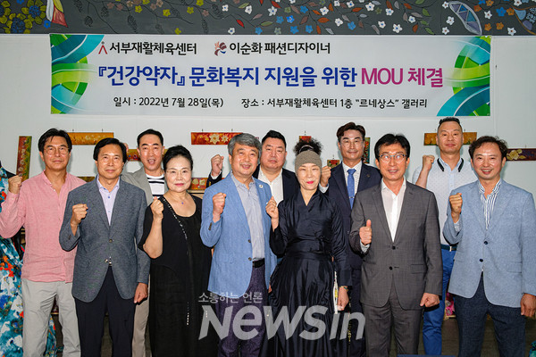 [뉴스인] 민경찬 기자 = 28일 오전 서울 은평구 구산동 서부재활체육센터 르네상스 갤러리에서 이순화 패션디자이너와 서부재활체육센터의 '건강약자' 문화복지 지원을 위한 업무협약식이 열려 이순화 디자이너(오른쪽 세 번째)와 황요섭 관장(왼쪽 세 번째)이 관계자들과 원활한 업무 협력을 다짐하고 있다.