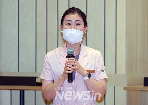 [뉴스인] 민경찬 기자 = 9일 오후 서울 송파구 대전대학교 서울한방병원 혜화홀에서 암 환우와의 대화 '팬플룻 힐링 버스킹'이 열려 이 병원 박찬미 간호사가 인사말을 하고 있다.