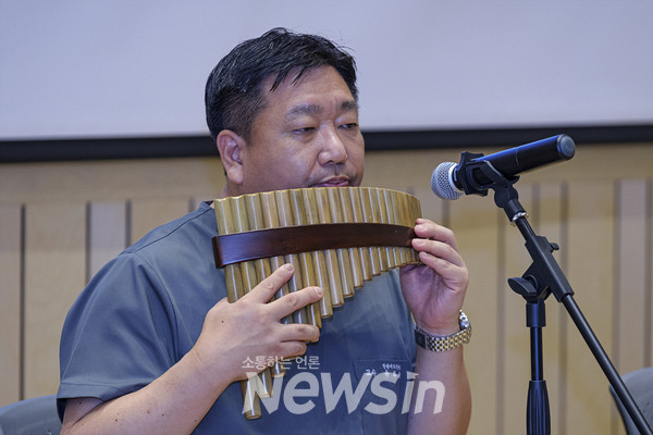 [뉴스인] 민경찬 기자 = 대전대학교 서울한방병원 유화승 원장이 9일 오후 서울 송파구 동 병원 혜화홀에서 암 환우와의 대화 '팬플룻 힐링 버스킹'을 열고 팬플룻을 연주하고 있다.