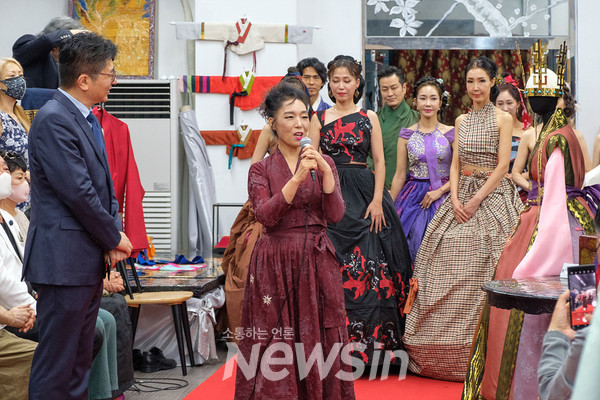 [뉴스인] 민경찬 기자 = 10일 오후 서울 은평구 서부재활체육센터 르네상스 갤러리에서 '그라시아스(Gracias)의 빛'이란 주제로 디자이너 이순화의 전통의상 전시회가 열려 런웨이를 마치고 이순화 디자이너가 인사말을 하고 있다.