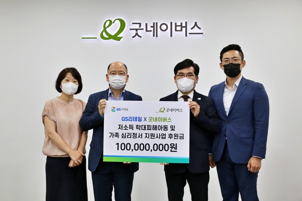 GS리테일이 글로벌 아동 권리 전문 NGO 단체인 굿네이버스와 함께 서울시 영등포구 소재 굿네이버스 회관에서 김원식 GS리테일 경영지원본부장, 김웅철 굿네이버스 사무총장 등이 참석한 가운데 ‘저소득 학대 피해 아동 및 가족 심리 정서 지원 사업 협약식’을 체결했다고 23일 밝혔다.