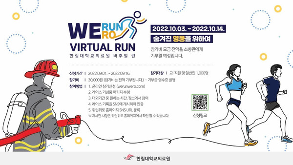 [뉴스인] 조진성 기자 = 한림대학교의료원은 ‘위런위로(WeRunWe路): 숨겨진 영웅을 위하여’ 행사를 오는 10월3일~14일 전국에서 비대면으로 진행한다. 참가 신청 기간은 1일~16일이다.