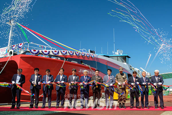 [뉴스인] 민경찬 기자 = 7일 오전 인천 연안부두 해양광장에서 고려고속훼리의 초쾌속선 '코리아프라이드호' 취항식이 열려 김승남 고려고속훼리 대표(왼쪽 여섯 번째)와 참석자들이 기념 테이프를 자르고 있다.