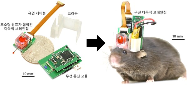 연구팀은 정밀한 투여량 조절이 가능한 초소형 펌프를 개발하고 미소 유체 채널이 형성된 0.1mm 크기의 브레인칩에 연결했다. 브레인칩에는 뇌신호 측정용 전극이 집적되어 있어 약물에 반응하는 뇌신호 정밀 측정을 가능하게 했다.