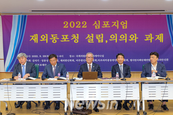 [뉴스인] 민경찬 기자 = 29일 오후 서울 여의도 국회의원회관 제3세미나실에서 '재외동포청 설립, 의의와 과제' 세미나가 열려 국승구 미주한인회총연합회 회장(가운데)이 제1세션 토론회에 패널로 참석해 토론하고 있다. '동포청' 설립은 윤석열 대통령의 공약사항이기도 하다.