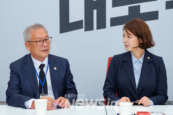 [뉴스인] 민경찬 기자 = 미주한인회총연합회 국승구 총회장(왼쪽)이 2일 오후 서울 영등포구 국회의사당 내 국민의힘 원내대표실을 방문해 배현진 의원과 간담회를 하고 있다.