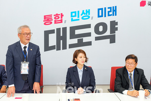 [뉴스인] 민경찬 기자 = 미주한인회총연합회 국승구 총회장(왼쪽)이 2일 오후 서울 영등포구 국회의사당 내 국민의힘 원내대표실을 방문해 배현진 의원과 간담회를 하고 있다.