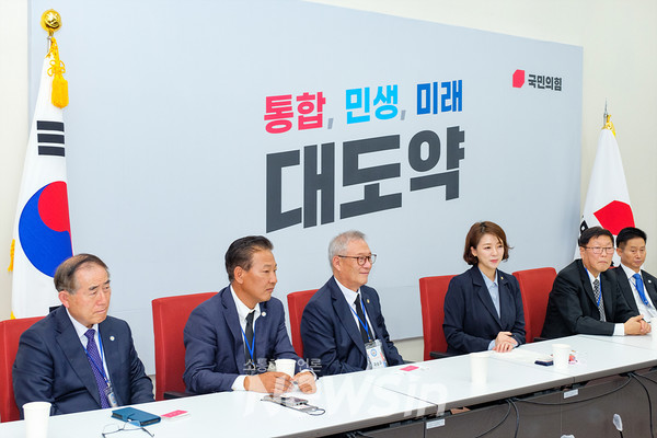 [뉴스인] 민경찬 기자 = 미주한인회총연합회 국승구 총회장(가운데)이 미주한인회 회장단과 함께 2일 오후 서울 영등포구 국회의사당 내 국민의힘 원내대표실을 방문해 배현진 의원과 간담회를 하고 있다.