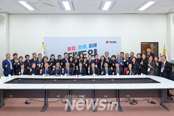[뉴스인] 민경찬 기자 = 미주한인회총연합회 국승구 총회장(왼쪽 다섯 번째)이 미주한인회 회장단과 함께 2일 오후 서울 영등포구 국회의사당 내 국민의힘 원내대표실을 방문해 배현진 의원(오른쪽 다섯 번째)과 간담회를 하고 있다.