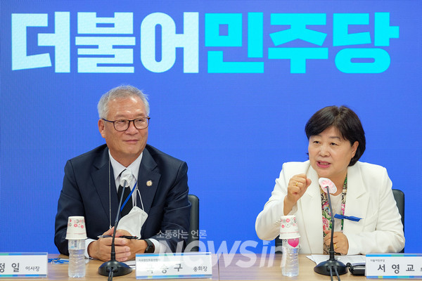 [뉴스인] 민경찬 기자 = 미주한인회총연합회 국승구 총회장(왼쪽)이 2일 오후 서울 영등포구 더불어민주당 중앙당사를 방문해 서영교 최고위원과 간담회를 하고 있다.
