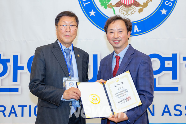 [뉴스인] 민경찬 기자 = 최명규 뉴스인미디어 대표(오른쪽)가 3일 오후 경기도 고양시 소노캄 고양 그랜드볼룸에서 열린 미주한인회총연합회의 밤 행사에서 미주한인회총연합회 제29대 한국 본부장에 임명돼 김병직 회장과 임명장을 들고 기념 촬영을 하고 있다.