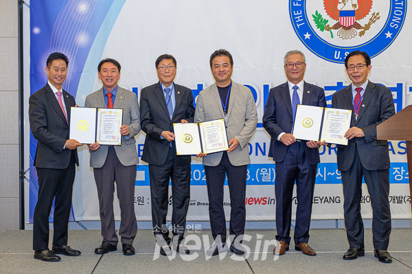 [뉴스인] 민경찬 기자 = 3일 오후 경기도 고양시 소노캄 고양 그랜드볼룸에서 미주한인회총연합회(총회장 국승구)의 밤 행사가 열려 연합회 회원들이 건의사항을 전달하고 있다. 왼쪽부터 미주한인회총연합회 서정일 이사장, 김석기 국민의힘 의원, 김병직 미주한인회총연합회 공동회장, 임종성 더불어민주당 의원, 국승구 미주한인회총연합회 총회장, 김성곤 재외동포재단 이사장.