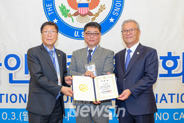 [뉴스인] 민경찬 기자 = 서동하 미주한인회총연합회 한국 지부장(가운데)이 3일 오후 경기도 고양시 소노캄 고양 그랜드볼룸에서 열린 미주한인회총연합회의 밤 행사에서 미주한인회총연합회 제29대 한국지부장으로 임명돼 김병직 공동회장(왼쪽)과 국승구 총회장과 함께 기념 촬영을 하고 있다.