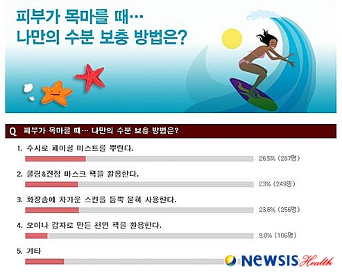 21일 위즈알엑스에 따르면 지난 7월11일~8월17일까지 회원 1084명을 대상으로 '피부가 목마를 때, 나만의 수분 보충 방법은?'이라는 설문조사를 실시한 결과 전체 응답자 26.5%인 287명이 '수시로 페이셜 미스트를 뿌리는 것'이라고 답했다.