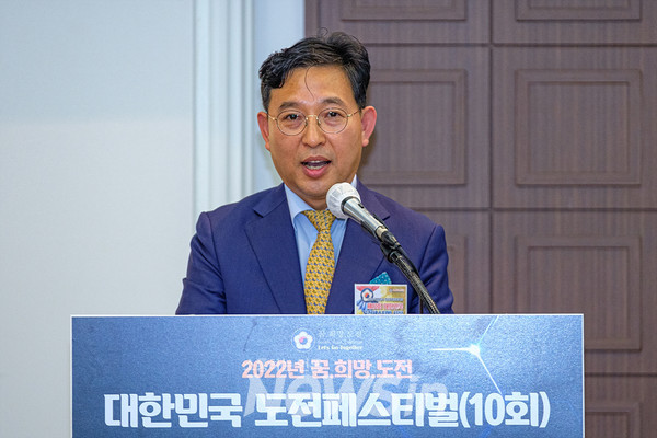 [뉴스인] 민경찬 기자 = 조영관 도전한국인본부 상임대표가 18일 오후 서울 중구 한국프레스센터 프레스홀에서 열린 2022 대한민국 천년희망프로젝트 ‘제10회 대한민국 도전페스티벌’ 시상식에서 인사말을 하고 있다.