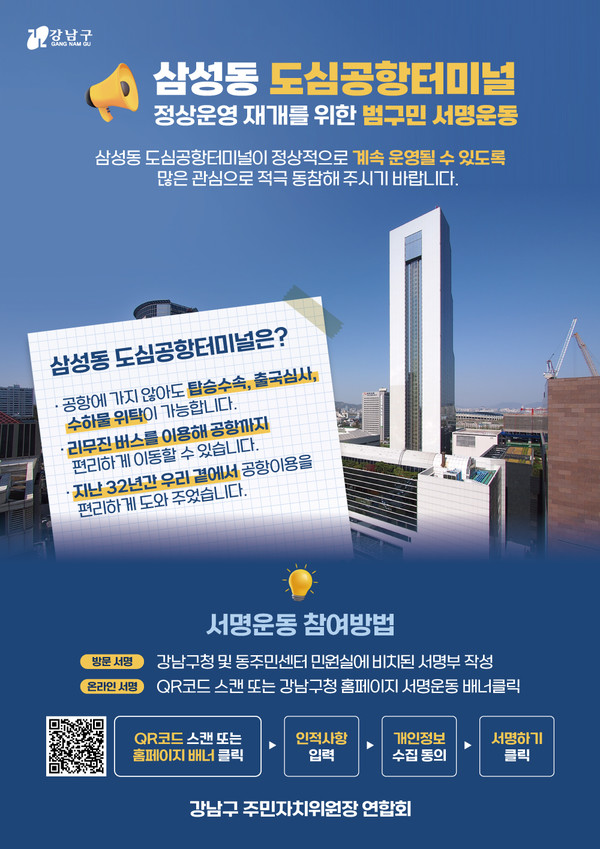 서명운동에 관심 있는 사람은 강남구청 홈페이지(홍보문 QR코드 스캔 또는 소통·참여>참여>도심공항터미널 서명운동)에서 간편하게 온라인으로 참여할 수 있으며, 구청 및 22개 동 주민센터에 방문해 수기로 서명부를 작성할 수 있다.
