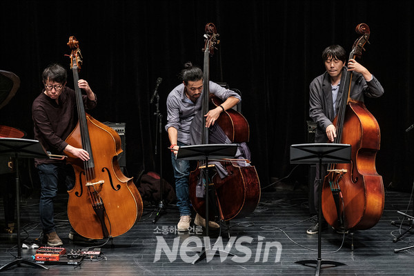 [뉴스인] 민경찬 기자 = 29일 오후 인천 부평아트센터 달누리극장에서 색깔있는 재즈 다섯 번째 '재즈 베이스 페스티벌'이 열려 베이시스트 이원술, 김성수, 김호철(왼쪽부터)가 트리오로 연주하고 있다.