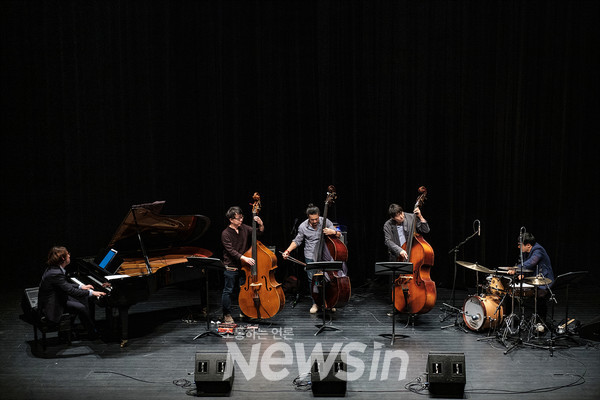 [뉴스인] 민경찬 기자 = 29일 오후 인천 부평아트센터 달누리극장에서 색깔있는 재즈 다섯 번째 '재즈 베이스 페스티벌'이 열려 피아니스트 강재훈, 베이시스트 이원술·김성수·김호철, 드러머 한웅원(왼쪽부터)이 연주하고 있다.