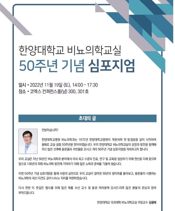 [뉴스인] 조진성 기자 = 한양대학교의료원 비뇨의학교실은 오는 19일 코엑스 컨퍼런스룸에서 설립 50주년을 맞이해 ‘50주년 기념 심포지엄’을 개최한다고 11일 밝혔다.