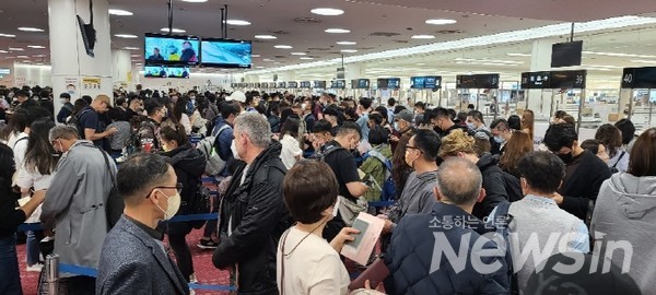 [뉴스인] 정경호 기자 = 지난 11일 일본 도쿄의 하네다 공항에서 외국인 관광객들이 입국 심사 순서를 기다리고 있다. 일본 자국민 입국심사대는 한가한 반면 외국인 여행객들은 약 2시간이 걸리는 입국심사에 여기저기서 불만이 터져나오기도 했다.