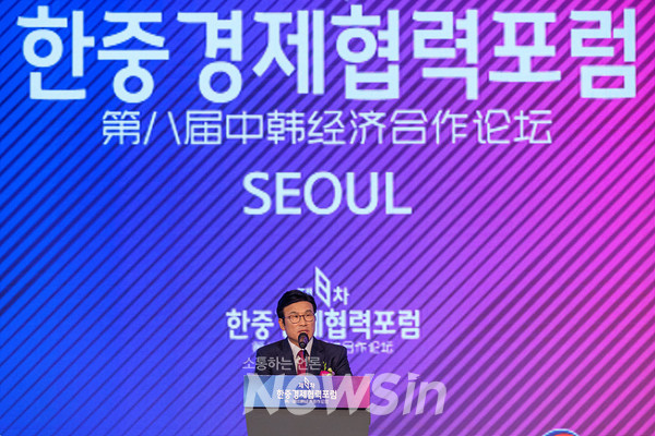[뉴스인] 민경찬 기자 = 지영모 한중민간경제협력포럼 이사장이 22일 오후 서울 광진구 비스타 워커힐 서울 비스타홀에서 열린 제8회 한중경제협력포럼 개회사를 하고 있다.