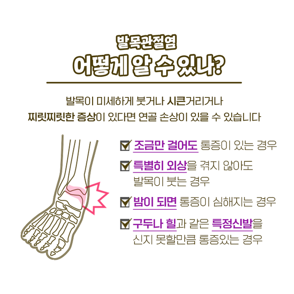 발목 연골의 두께는 1㎜ 정도로 아주 얇다. 그래서 한번 손상되면 진행이 빨리 된다. 발목에 지속적인 통증과 부종 등 불편함이 있고, 손가락으로 눌렀을 때 압통이 있으며, 발목 관절의 움직이는 정도가 감소 됐을 때 발목 연골 손상을 의심해봐야 한다.