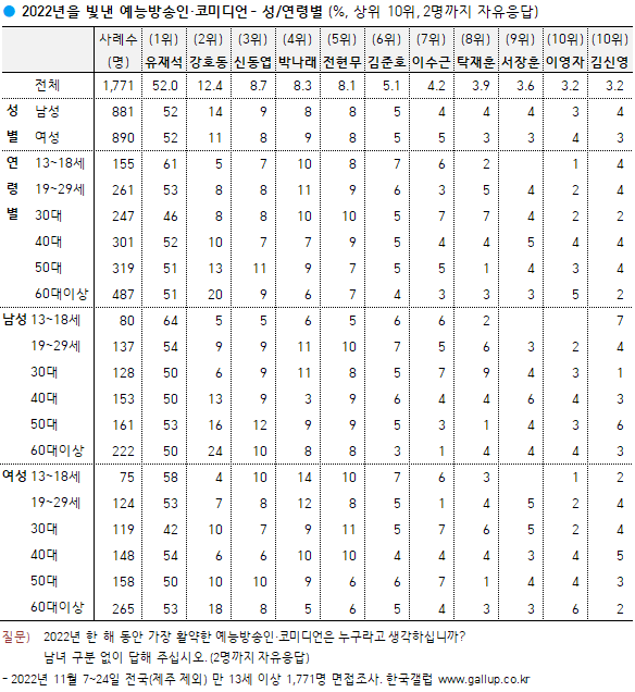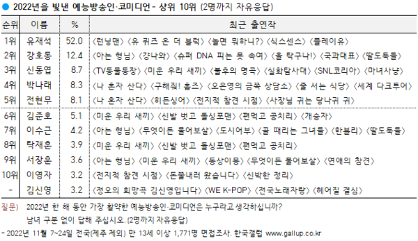 [뉴스인] 김태엽 기자 =한국갤럽이 2022년 11월 7일부터 24일까지 전국(제주 제외) 만 13세 이상 1,771명에게 올 한 해 가장 활약한 예능방송인·코미디언을 두 명까지 물은 결과(자유응답), 유재석이 52.0%의 지지를 얻어 11년 연속 1위에 올랐다.