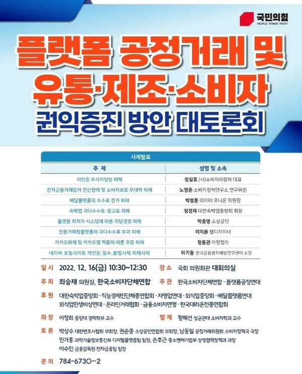 [뉴스인] 조진성 기자 = 국민의힘 소상공인위원회 위원장인 최승재 의원은 지난 16일 대형 플랫폼 업체의 불공정 거래 행태, 소비자 권익증진 방안과 관련한 토론회를 국회 의원회관 대회의실에서 열었다.