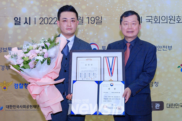 [뉴스인] 민경찬 기자 = 한국자산연구원 김연욱 대표(왼쪽)가 19일 오후 국회의원회관 제1 소회의실에서 열린 '제17회 2022 대한민국사회공헌대상 시상식'에서 과학기술정보통신부 장관상을 받은 후 기념 촬영을 하고 있다.
