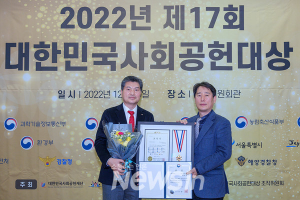 [뉴스인] 민경찬 기자 = 무강 한국화 연구소 박창로 화백(왼쪽)이 19일 오후 국회의원회관 제1 소회의실에서 열린 '제17회 2022 대한민국사회공헌대상 시상식'에서 외교부 장관상을 받은 후 기념 촬영을 하고 있다.