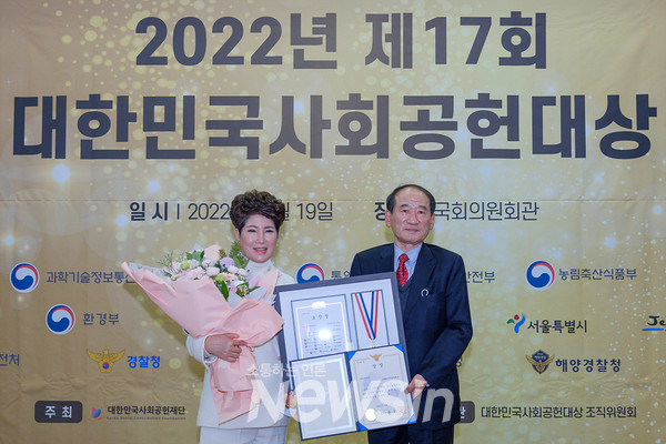 [뉴스인] 민경찬 기자 = (주)예신건강가꾸기 김모정 대표(왼쪽)가 19일 오후 국회의원회관 제1 소회의실에서 열린 '제17회 2022 대한민국사회공헌대상 시상식'에서 경찰청장상을 받은 후 기념 촬영을 하고 있다.