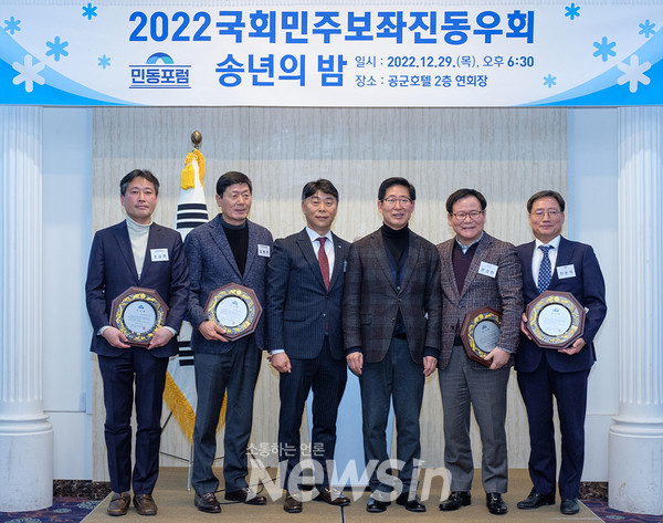 [뉴스인] 민경찬 기자 = 29일 오후 서울 동작구 대방동 공군호텔 연회장에서 2022 국회민주보좌진동우회(민동포럼) 송년회가 열려 감사패 수상자들이 기념 촬영을 하고 있다. 왼쪽부터 조요한 상임부회장, 임병주 상임부회장, 양시헌 회장, 양승조 전 충남도지사, 문경환 고문, 신은식 고문.