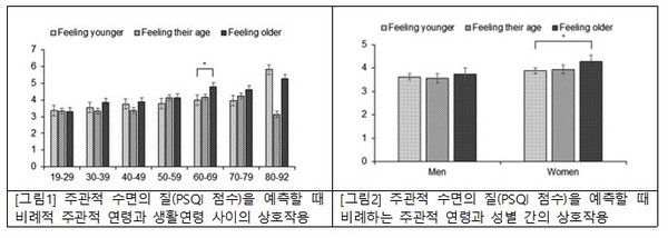 또 “노화에 대한 자기 인식을 나타내는 ‘주관적 나이’는 최근 연구결과에 따르면 스스로 나이가 많다고 느낄수록 낮은 신체활동, 높은 입원률, 우울증 및 치매 발생률 증가 등 건강과 밀접함이 밝혀졌고, 이러한 건강 이상 역시 수면의 질과 밀접한 연관성이 있기 때문에, 실제 나이를 넘어 의식적으로 ‘젊다’라는 생각이 수면의 질 개선을 위한 중재 치료로 활용할 수 있다”고 덧붙였다.