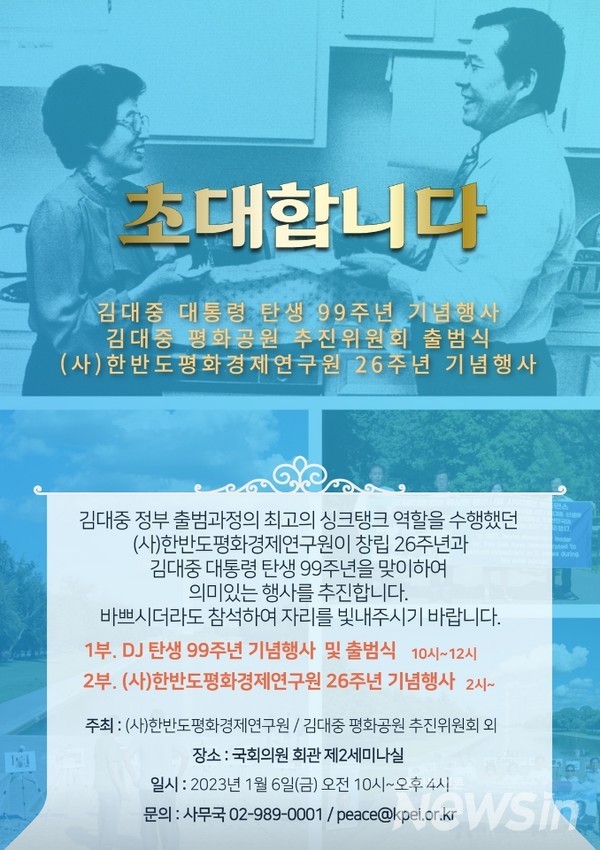 [뉴스인] 조윤희 기자 = 김대중 정부 출범과정의 싱크탱크 역할을 수행했던 (사)한반도평화경제연구원(이사장 최성)이 창립 26주년과 김대중 대통령 탄생 99주년을 맞아 오는 6일(금) 국회의원회관 제2세미나실에서 행사를 개최한다.