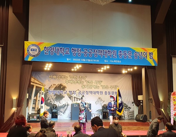 [뉴스인] 김태엽 기자 =한양대학교 행정·공공정책대학원 총동문회는 지난해 12월 21일 서울 왕십리역 디노체컨벤션에서 전국에서 활동 중인 300여명의 동문들이 참석해 2022년도 '행정·공공정책인의 밤' 행사를 열어 한 해를 마무리 하는 뜻 깊은 시간을 보냈다.