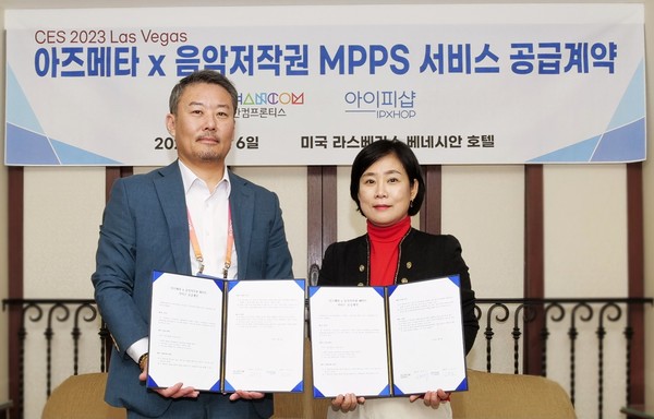 [뉴스인] 조진성 기자 = 지식재산권 거래 플랫폼 아이피샵(대표 이효성)이 CES 2023이 열리는 라스베가스에서 메타버스 플랫폼 개발사, ‘한컴프론티스(대표 정현석)’와 아이피샵의 새로운 음원솔루션 ‘MPS’(Music Providing System)의 공급계약을 체결했다고 9일 밝혔다.