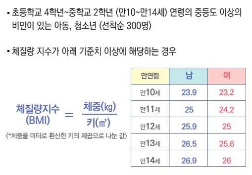 이번 아이캔 대상은 초등학교 4학년에서 중학교 2학년(만10~14세)까지 중등도 이상의 비만 아동 청소년이며, 300명까지 선착순으로 받는다.