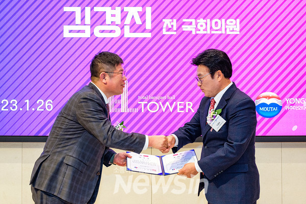 [뉴스인] 민경찬 기자 = 26일 오후 서울 양재동 엘타워 엘하우스홀에서 한중민간경제협력포럼 신년하례회가 열려 김경진 전 국회의원(왼쪽)이 지영모 이사장으로부터 고문에 위촉되고 있다.
