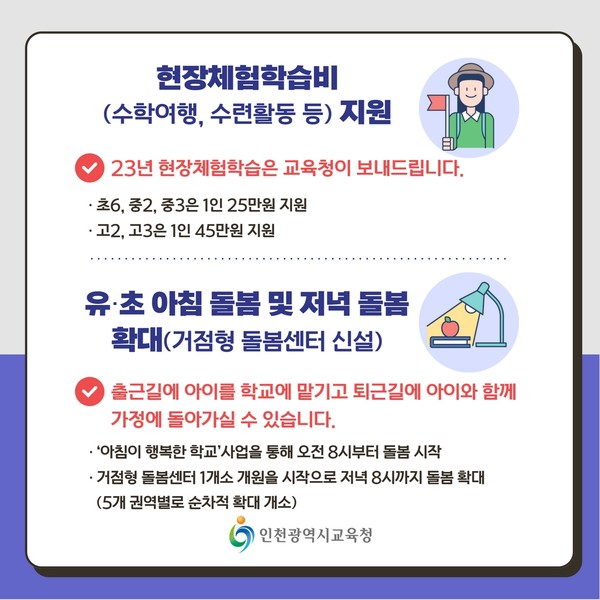 인천광역시교육청(교육감 도성훈)은 3월 개학을 맞아 학부모가 꼭 알아야 할 2023학년도 달라지는 인천교육 정보를 안내했다. 인천의 모든 초등학교 신입생은 3월 중 1인당 20만 원씩 초등입학준비금을 현금으로 지원받는다. 중고등학교 신입생에게는 기존 교복비 지원에 더해 체육복도 지원한다. 다자녀가정은 추가로 20만 원의 신학년 학습준비비와 최대 28만 원 범위 안에서 체험학습비를 지원받을 수 있다.