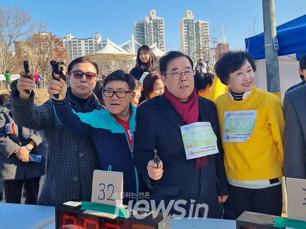 [뉴스인] 26일 오전 서울 뚝섬한강공원 수변 마당에서 '소아암 환우에게 희망을! 한국여성유권자연맹과 함께하는' 제17회 '2023 아! 고구려 역사지키기 마라톤대회'가 열려 대회장인 한국유권자연맹 이은주 중앙회장(오른쪽부터), 박성종 국민의힘 의원, 한국방송코미디언협회 엄영수 회장, 황종환 뉴스인미디어 부회장이 출발 신호 준비를 하고 있다. (편집부)