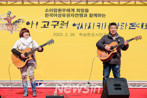 [뉴스인] 민경찬 기자 = 26일 오전 서울 뚝섬한강공원 수변 마당에서 '소아암 환우에게 희망을! 한국여성유권자연맹과 함께하는' 제17회 '2023 아! 고구려 역사지키기 마라톤대회'가 열려 '통기타 젬스'가 7080 음악을 들려주며 참가자들을 응원하고 있다.