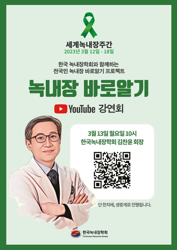 이와 함께 전국의 학회 회원 소속 병·의원에서는 녹내장 지역 환자와 보호자를 위한 교육 강좌를 온오프라인 형식으로 진행할 예정이다. 전 국민을 대상으로는 ‘녹내장 바로알기’ 유튜브 강연회를 오는 13일 오전 10시 학회 채널에서 생중계로 진행한다. 한국녹내장학회 김찬윤 회장이 연자로 나서 녹내장에 대한 올바른 이해를 돕기 위해 강연을 펼칠 예정이다.