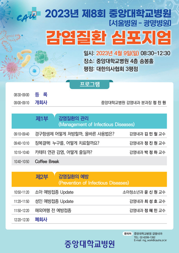 코로나19 장기화로 3년 만에 대면으로 진행되는 이번 심포지엄은 중앙대병원 · 중앙대광명병원 교수진이 함께 강연에 나서 '감염질환의 치료와 예방'이라는 주제로 경구 항생제 치료, 카테터 관련 감염 치료, 최신 백신과 예방접종 등 다양한 내용으로 구성됐다.