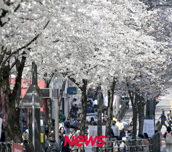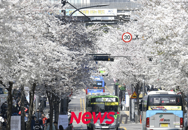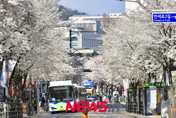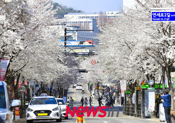 [뉴스인] 김가현 인턴기자 = 30일 오후 신촌 전철역에서 연세대 앞에 이르는 서대문구 연세로는 많은 시민들로 붐비는 가운데 일반차량들이 막힘없이 통행하고 있다. 연세로에는 올해 1월 20일부터 일반차량 통행이 허용됐으며 현재 활짝 핀 벚꽃이 시민들에게 아름다운 봄 풍경을 선사하고 있다. 이곳 벚꽃 개화는 예년보다 2주가량 빠른 추세를 보이고 있다.
