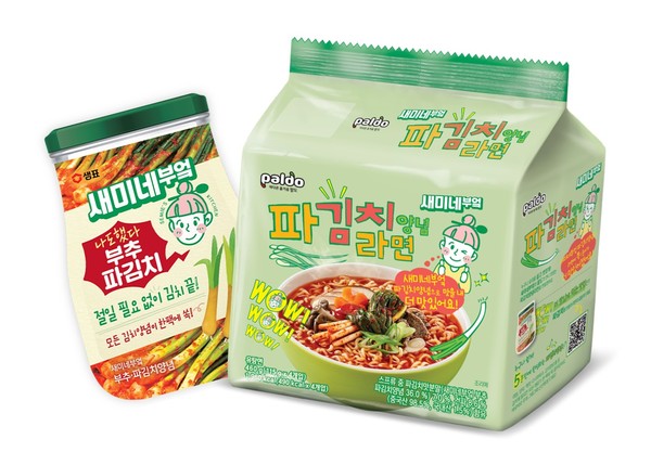13일 롯데마트와 롯데슈퍼가 선보인 ‘팔도Ⅹ새미네부엌 파김치양념라면’은 ‘새미네부엌 부추파김치양념’을 베이스로 한 제품이다. 라면과 김치는 세대불문 환상의 조합으로 꼽히는데다, 최근 TV예능 프로그램의 영향으로 파김치에 대한 관심이 높아지자 새미네부엌 파김치양념으로 국물 맛을 낸 라면이 출시됐다.