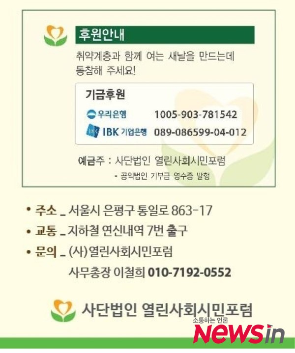 [뉴스인] 윤은중 기자 = 지역사회의 혁신과 상생의 문화를 정착시키고, 건강한 마을공동체 조성으로 시민복지와 열린사회의 기틀을 마련하기 위해 2019년 6월 서울시 비영리 법인 설립 허가를 받고, 지금까지 소리 소문 없이 소외계층 공동체 형성에 앞장서 온 사단법인 “열린사회시민포럼”이 6월 24일(토) 오후 6시30분 서울 은평구 통일로에 새 보금자리를 마련했다.
